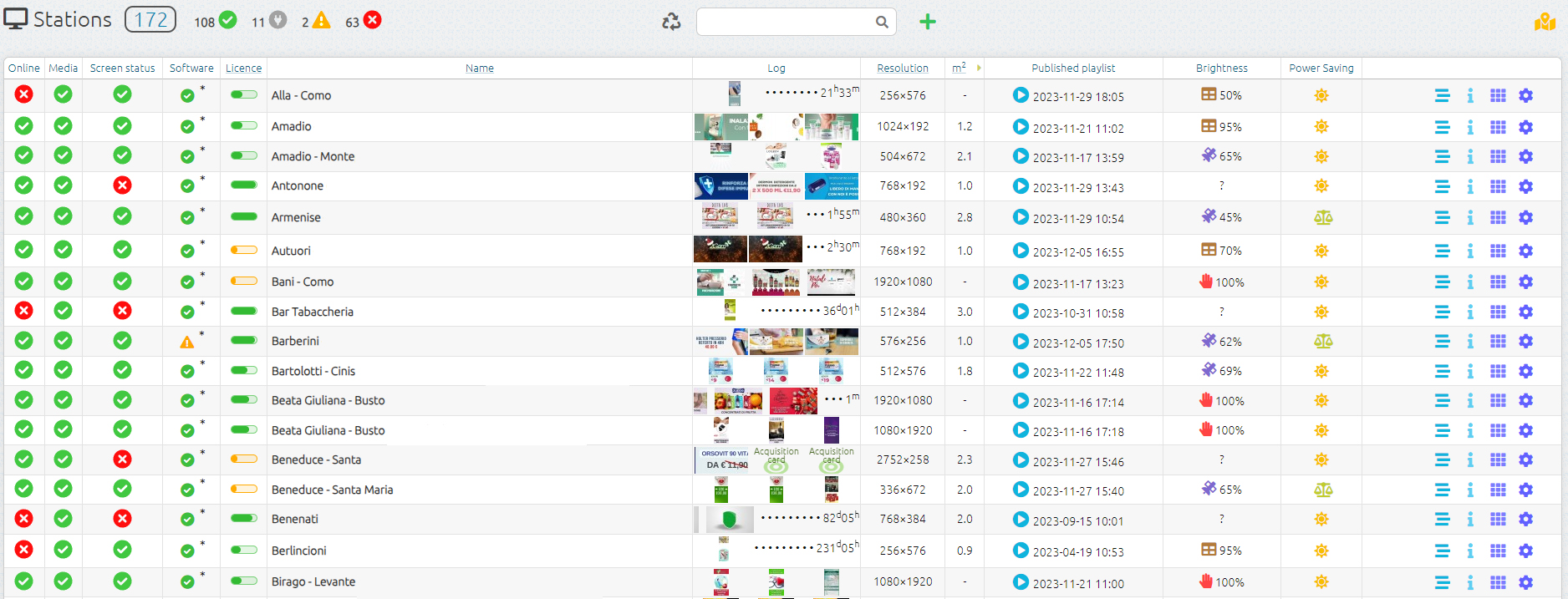 From the Home page, you can monitor the status of every online station (player), update their content and scheduling, and access additional information such as log files, screenshots, system specifications, operating system details, brightness levels, and more.
