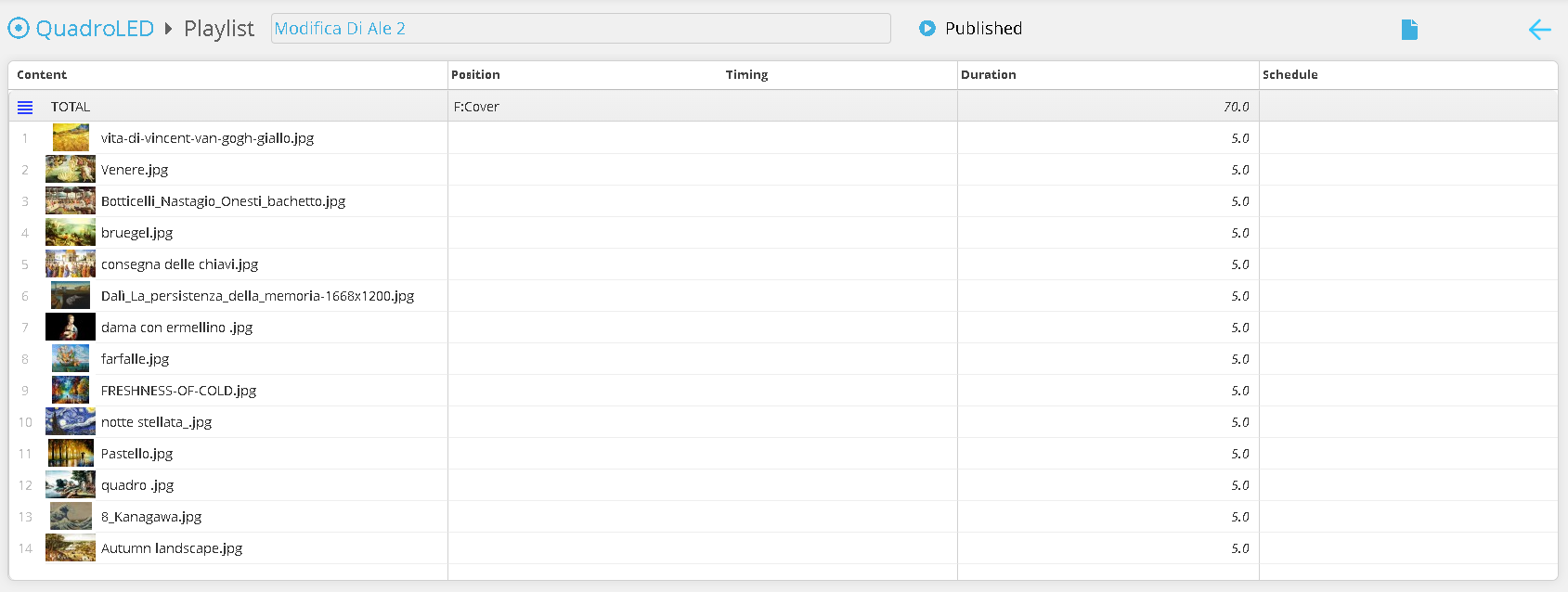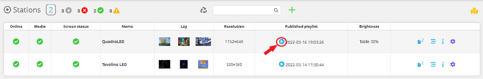 In the Published Playlist column, by clicking on the image you can access the published playlist — the one currently being played by the station.