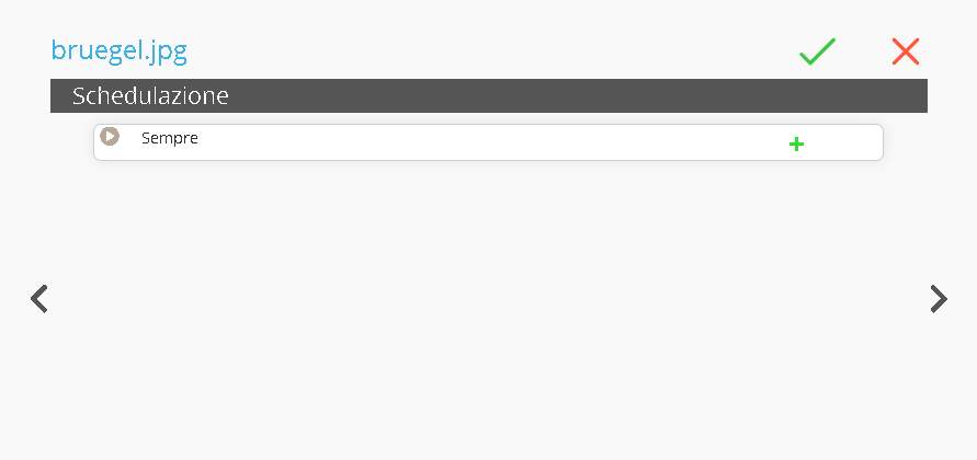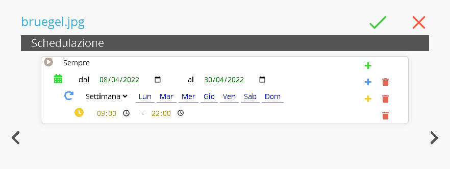 Ad esempio programmare i video per l'apertura/chiusura di un negozio, in questo caso il media "bruegel.jpg" verrà riprodotto dal giorno 8 aprile 2022 al 30 aprile 2022, dal lunedì alla domenica, dalle 9 del mattino alle 22 di sera.